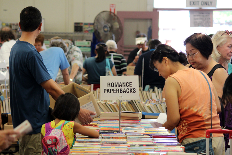 Alex here!  Most of what Misty said was on the mark.  The layout is similar to previous years and as usual, when the shelves start getting emptier they bring in the boxes with even more books!  So, even if you don’t see something one day, you may have to come back sometime later in the week because you never know what new books might be put on the shelf.  As usual, Hawaiiana is a bit more expensive, although if you really like local fiction, you might find some really good deals on those books.  I tried to take a lot of pictures this year to capture the feel of the sale, hope you enjoy them: